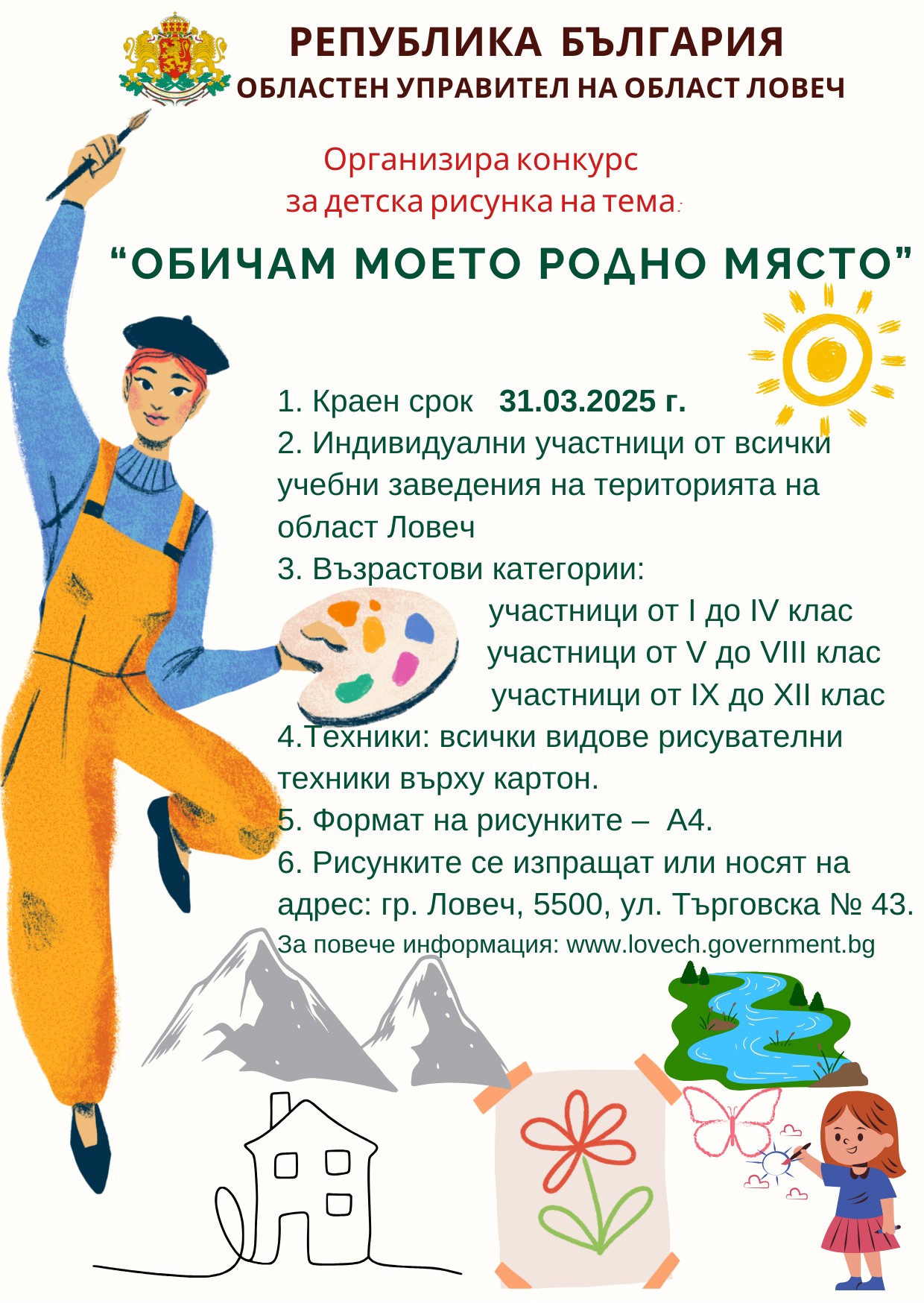Конкурсът за детска рисунка на тема „Обичам моето родно място“ е инициатива на Областна администрация Ловеч. Идеята е ученици от 1 до 12 клас от област Ловеч да създадат творби, които да бъдат използвани от областния управител на област Ловеч за популяризиране на областта. Целите на конкурса са: да възпитава в родолюбие чрез изучаване и преоткриване красотата на родния край, да провокира творчески прояви в областта на изобразителното изкуство, да насърчава за откривателска и краеведческа дейност. Творбите са оценени от компетентно жури по критерии: композиция, оригиналност, техническо изпълнение. Осигурени са награди и грамоти на победителите. Отличените творби са подредени в изложба в сградата на администрацията, а авторите им са наградени от областния управител на специална церемония. Резултатите от конкурса са обявени на Интернет страницата на Областна администрация Ловеч.