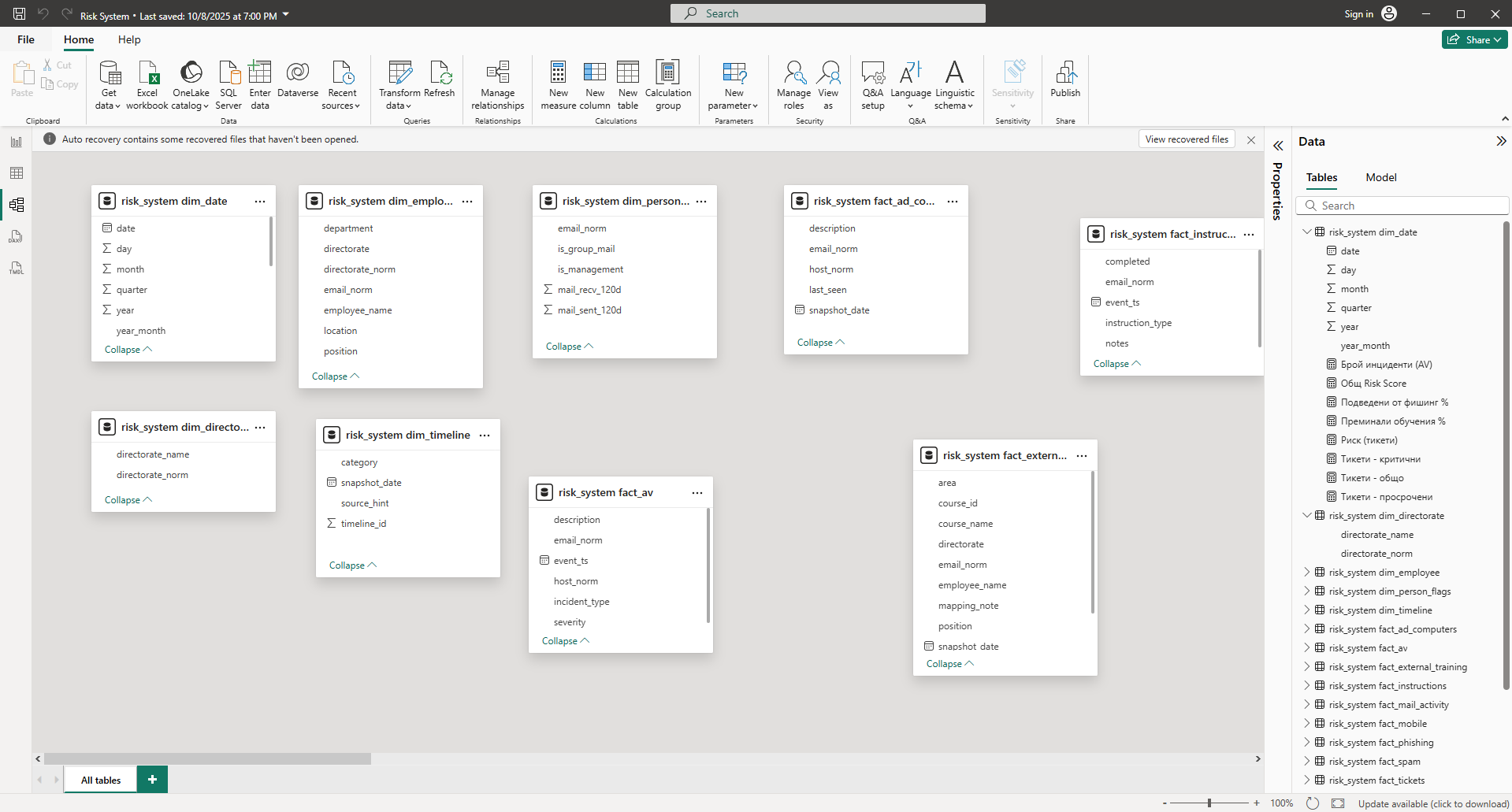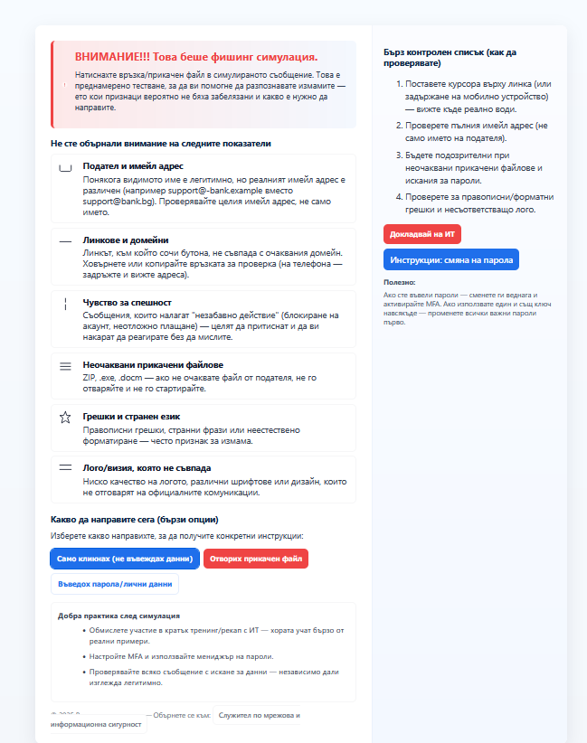 Интегрираната система за анализ и управление на риска за информационната сигурност (Risk System – МТСП) използва системи с отворен код, LLM модели и достъпни програмни средства за оперативно обединяване на данни от различни източници (обучения, фишинг симулации, инциденти и др. динамично), моделиране на рискови показатели (KPI), изграждане на обучения и микрообучения по ИС, както и формира и анализира тренинг с фишинг симулации. Системата визуализира и проследява динамиката на риска и подпомага управлението на човешкия и техническия риск в ИС.